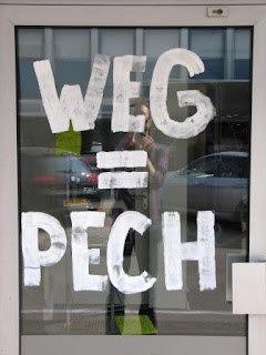 Ik zou er deze keer aan voorbij gelopen zijn, als S. niet de aandrang had gevoeld er naar binnen te stappen. In de van haar bekende vastberaden tred, stapte ze binnen op de eigenaar af, en vroeg hem naar authentieke details van het pand. Hij nam ons vervolgens in de goederenlift mee naar de derde, vierde en vijfde verdieping en toonde ons de verlaten etages van het gebouw, en vertelde ondertussen over opkomst en ondergang van sigarenfabriek Ernst Casimir, die hier oorspronkelijk gevestigd was. Dat was een naam die we al eerder hadden gezien, en die innig met de recente geschiedenis van de stad verbonden was. Tussen de steunbalken onder de plafonds wees hij ons op de sigarenmallen die als dwarsverbindingen fungeerden – een bijna al even onopvallende erfenis.