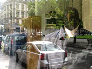 Ik zag een meisje stilstaan op het trottoir en met open mond ergens naar kijken. Ik volgde haar blik en merkte aan de overkant van de straat, langs het water, een ander meisje op. Het tweede meisje (trainingspak, paardenstaart) op haar beurt had haar aandacht volkomen gericht op een raampje van de bovenste verdieping van de gevangenis, aan de overkant van het water, over de muur, vlak onder het dak met de grijze schoorsteentorentjes. Achter dat raampje zat een jongeman in ontbloot bovenlijf die met zijn armen over elkaar op de vensterbank van zijn cel leunde. Ook hij keek geconcentreerd voor zich uit, naar zijn vriendinnetje of zus die langs het water stond. Zij maakte grote gebaren met een arm. Ik fietste voorbij, keek even naar haar, keek weer voor me op de weg, en keek nog eens om. Toen zag ik dat ze met een vinger letters schreef op een denkbeeldige ondergrond, de ene na de andere. Ze schreef een zin, een boodschap, een lange boodschap, een verhaal misschien zelfs, in het luchtledige. Geluidloos. Hij las het aandachtig, zij schreef het, geconcentreerd. En een van de twee deed dat in spiegelschrift.